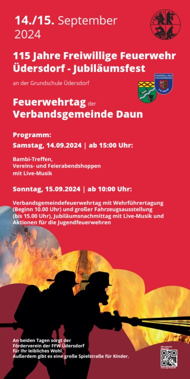 Am 14. und 15. September 2024 wird rund um die Grundschule Üdersdorf einiges geboten, denn es gibt gleich mehrfachen Grund zum Feiern: Neben dem Feuerwehrtag der Feuerwehren der Verbandsgemeinde Daun feiern wir auch das 115-jährige Jubiläum der Freiwilligen Feuerwehr Üdersdorf, verbunden mit dem 40-jährigen Bestehen der Jugendfeuerwehr und des Fördervereins der Freiwilligen Feuerwehr Üdersdorf.