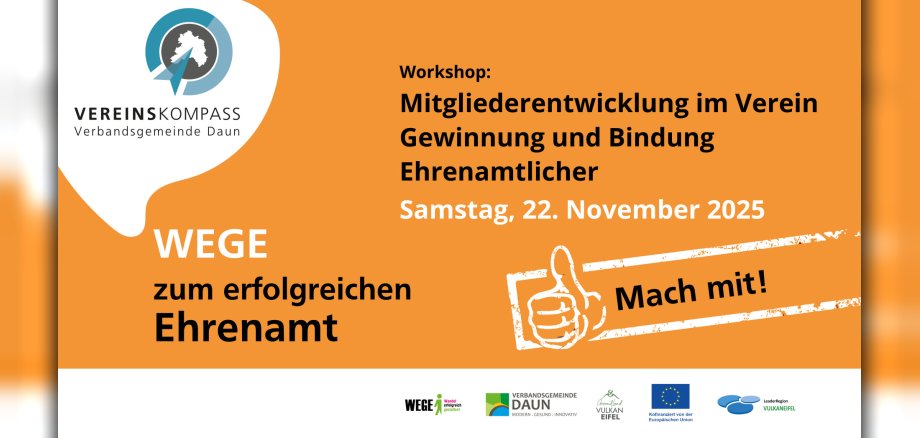 Herzliche Einladung zum ersten Workshop unseres Weiterbildungsangebotes für Ehrenamtliche "VereinsKompass Verbandsgemeinde Daun" mit dem Thema: Mitgliederentwicklung im Verein - Gewinnung und Bindung Ehrenamtlicher.