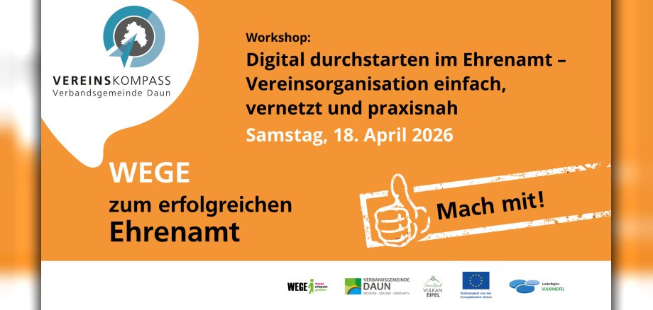 Mit dem LEADER-Projekt „VereinsKompass VG Daun – WEGE zum erfolgreichen Ehrenamt“ wird das Ehrenamt gestärkt! In den kommenden zwei Jahren erwartet Ehrenamtliche ein vielseitiges Weiterbildungsprogramm mit 13 Präsenz- und 10 Online-Seminaren. Zusätzlich laden vier digitale Vereinsstammtische zum Austausch, Netzwerken und voneinander Lernen ein.